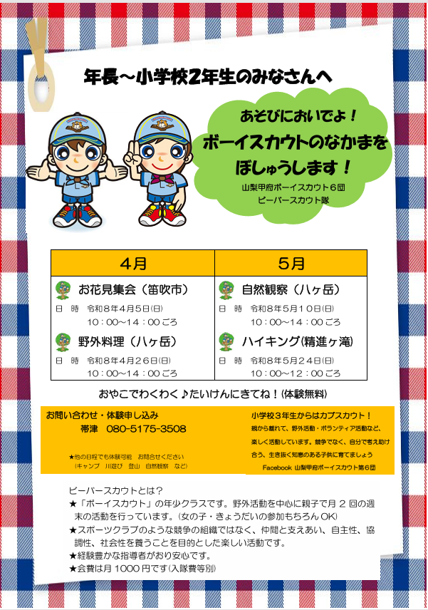 体験入隊のご案内 2025.10.232026.03.07 ・ビーバー隊 体験入隊にご興味がありましたら、是非お気軽にご参加ください。 わからない事などがありましたら、お問い合わせフォームからお問い合わせください。